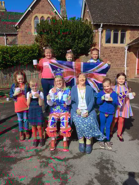 Coronation Day was celebrated in full style at Dunster First School. The children turned up to school wearing the colours of the Union Flag, red white and blue.