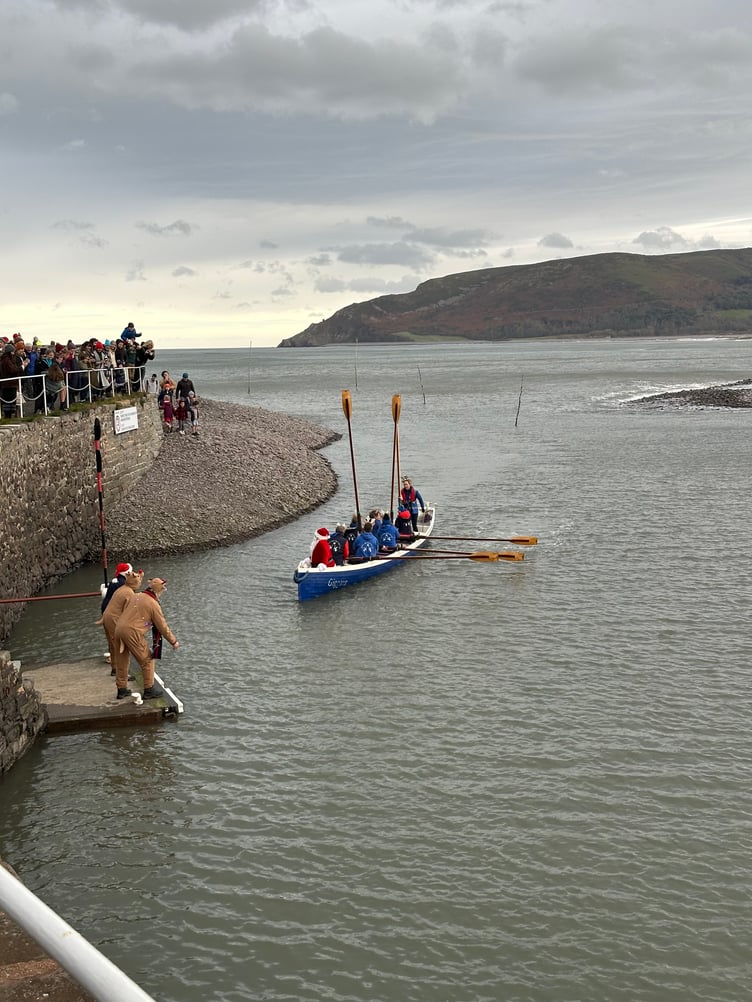 Soon after, Santa made a grand entrance, rowed in by the Porlock Weir Gig Club to the delight of the crowd gathered along the harbour wall.